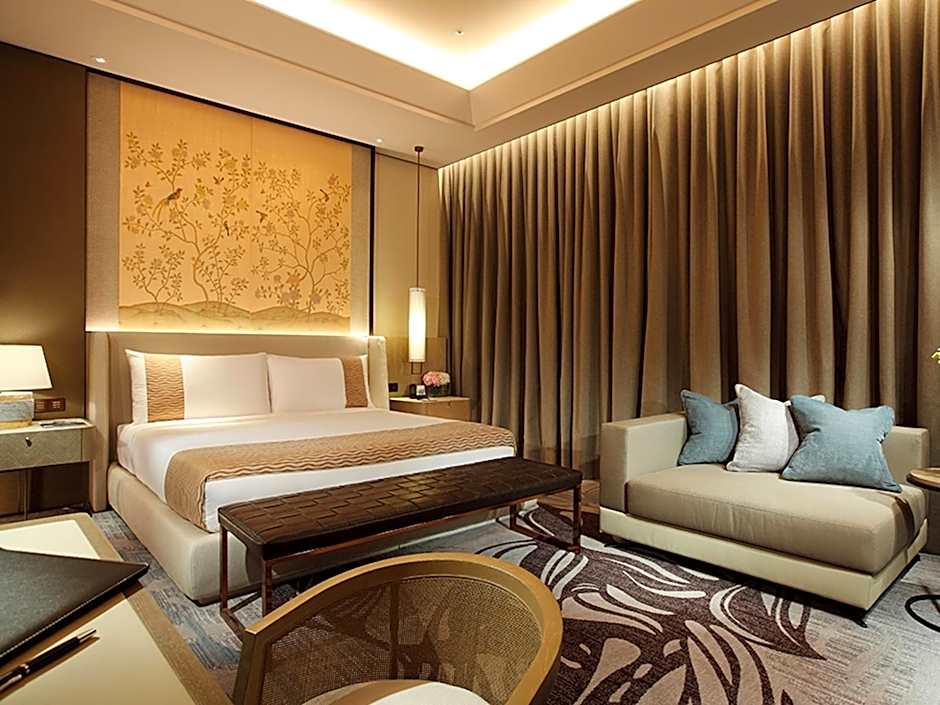 This room offers 3.4-yard-high ceilings and is complemented with floor-to-ceiling windows, a walk-in marble shower, a separate bathtub, high-tech entertainment equipment and furnishings. Featuring an in-room control for lighting and curtain, it comes with individually controlled air conditioning, signature beddings, independent walk-in closet, cordless phone, full-size working desk, Taiwan hand-made ceramic clay teapot set, electronic safe box, chaise longue and coffee table, and extensive pillow menu on demand. Fresh fruit, freshly brewed coffee and mini-bar are also available.